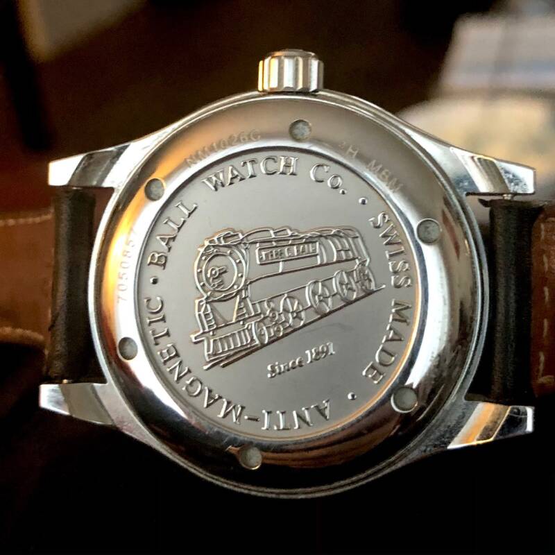 This Engineer II Ohio refers to the history of Ball watches and its role in making the American Railroads more safe (see sidebar). On the case back there is a beautiful embossed drawing of a train. Ball is also known for its tritium tubes as a means to make the dial more visible in dark surroundings. Notice the vertical tubes that function as the time markers on this watch. Magnificent. You can also find them on the hands of the watch. At the back of the seconds hand you will find the famous 'RR'.