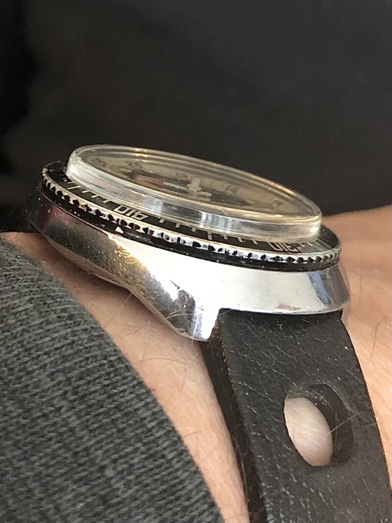 This magnificent Crosby Diving watch, waterproof to 330 feet is in fact a French Yema Meangraf Diving, produced in the early 70's and exported to the United States so it could be sold as a Crosby watch. It came on the diving strap of that time, a TROPIC Sport. The white band on the dial is characteristic vor the Meangraf Diving series of Yema. I love the robust case with hidden lugs, the sporty look with elapsed time diving bezel, 24 hours inner bezel and the racing stripes surrounding the dial. A typical product of the funky 70's!