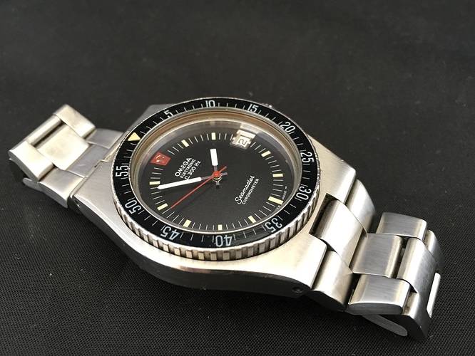 This "Jumbo" Seamaster Electronic f300 (198.0005) is a chunky piece. This is further emphasized by the integrated stainlees steel bracelet (1178). It has a beautiful mat aged black dial with applied Omega logo @ 12 o'clock.