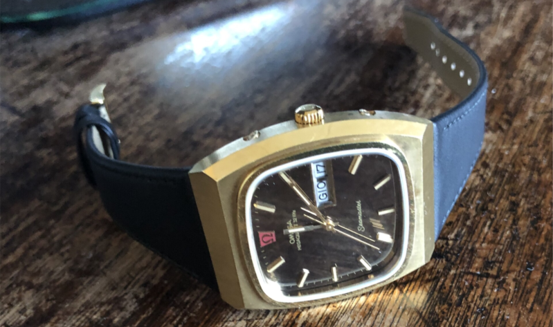 A beautiful chocolate brown dial in a massive 20 micron gold plated case on an original black Omega leather strap and buckle. Another 70's model with a great wrist presence. A vintage Omega Seamaster for the Italian market.