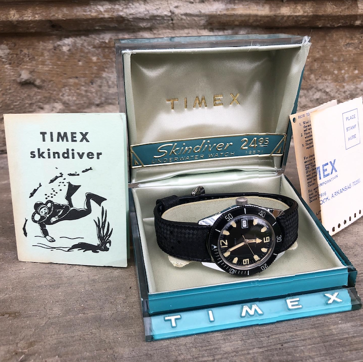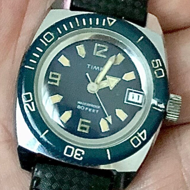 Starting in 1966 with 600 feet, TIMEX reduced the depth rate in 1968 to 200 feet and in 1970 the depth rate dissapeared from the dial alltogether. Only the European models (both skindiver as welll as sport models) the depth rate of 25 Metres can be found. I guess that TIMEX found out that their watches weren't as waterproof as they suggested and they had to adapt and manage expectations.