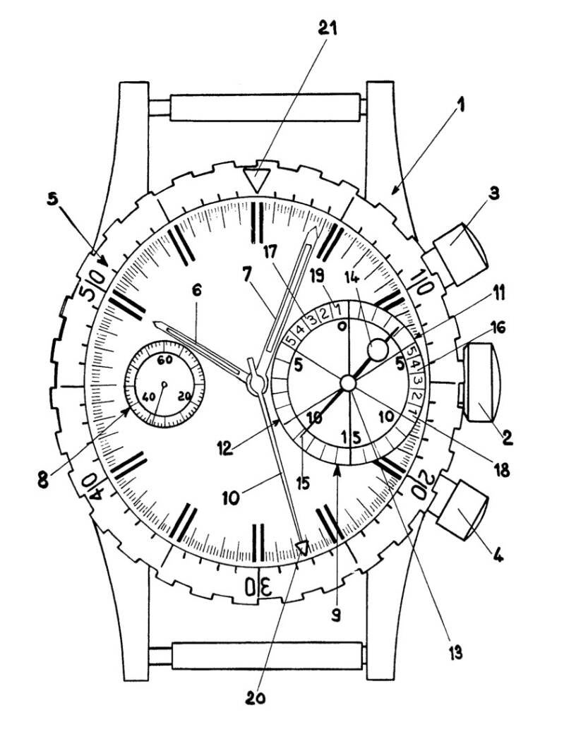 The patent was filed for a watch for Yachting and underwater use. The count down diver bezel was an important part of the watch.